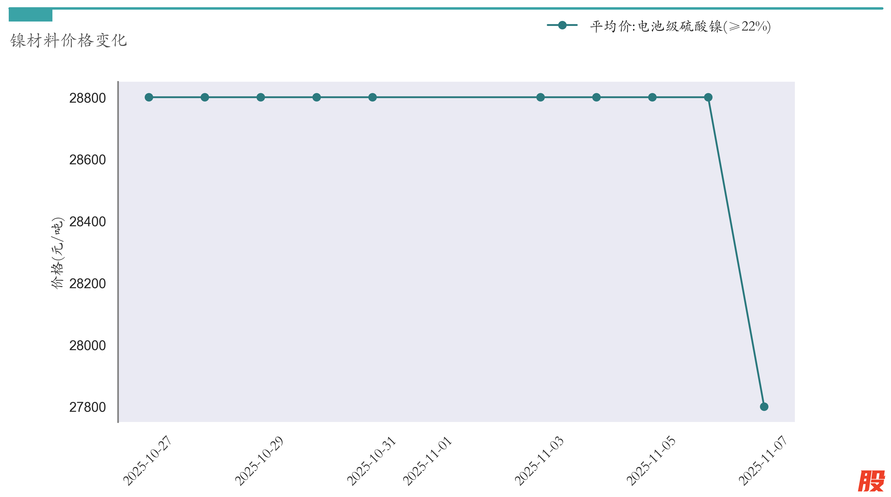 截至11月7日,电池级硫酸镍平均报价为27800元/吨,较10月31日下跌1000元/吨。近两周镍材料价格变化如下图所示: