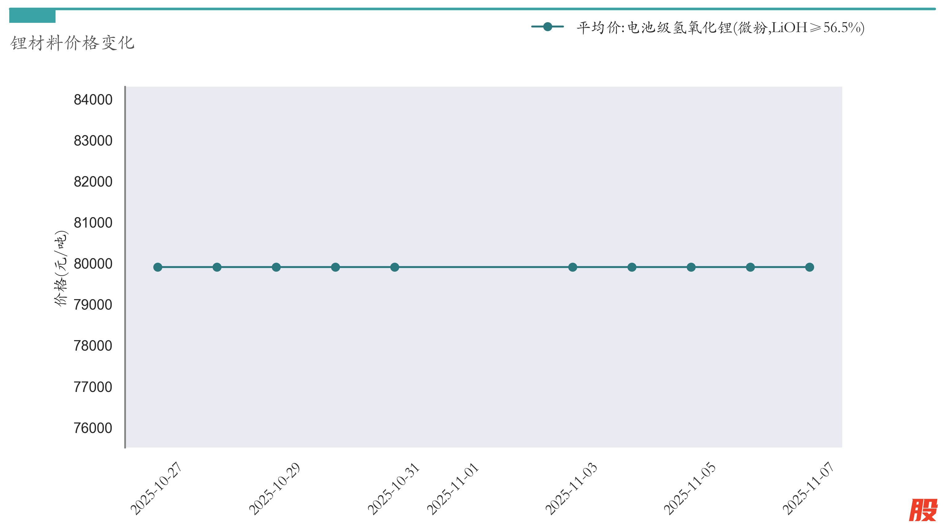 截至11月7日,电池级氢氧化锂平均报价为79900元/吨,较10月31日持平。近两周氢氧化锂价格变化如下图所示: