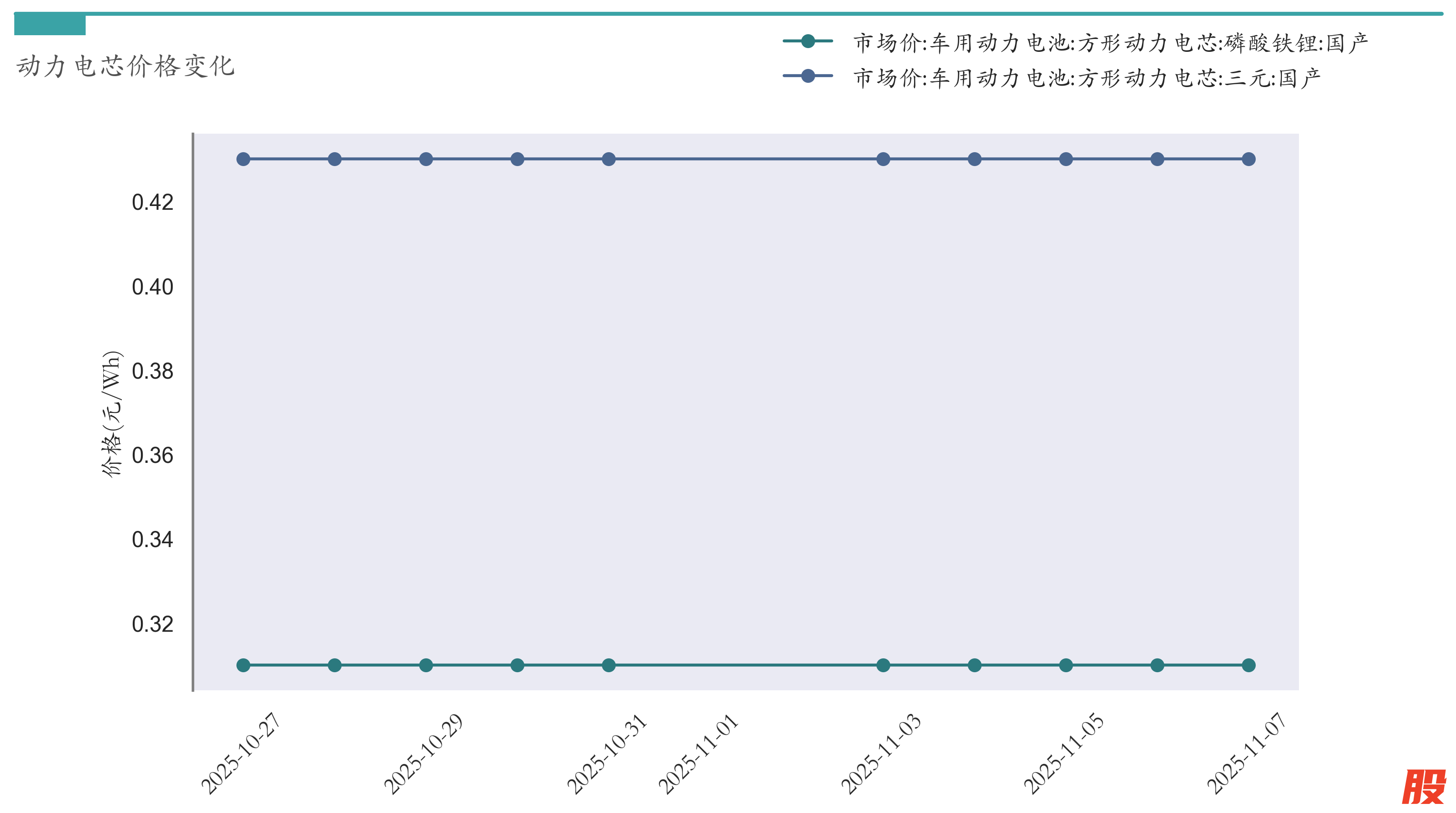 截至11月7日,方形动力电芯(磷酸铁锂)市场报价为0.31元/Wh,较10月31日持平。方形动力电芯(三元)市场报价为0.43元/Wh,较10月31日持平。近两周动力电芯价格变化如下图所示: