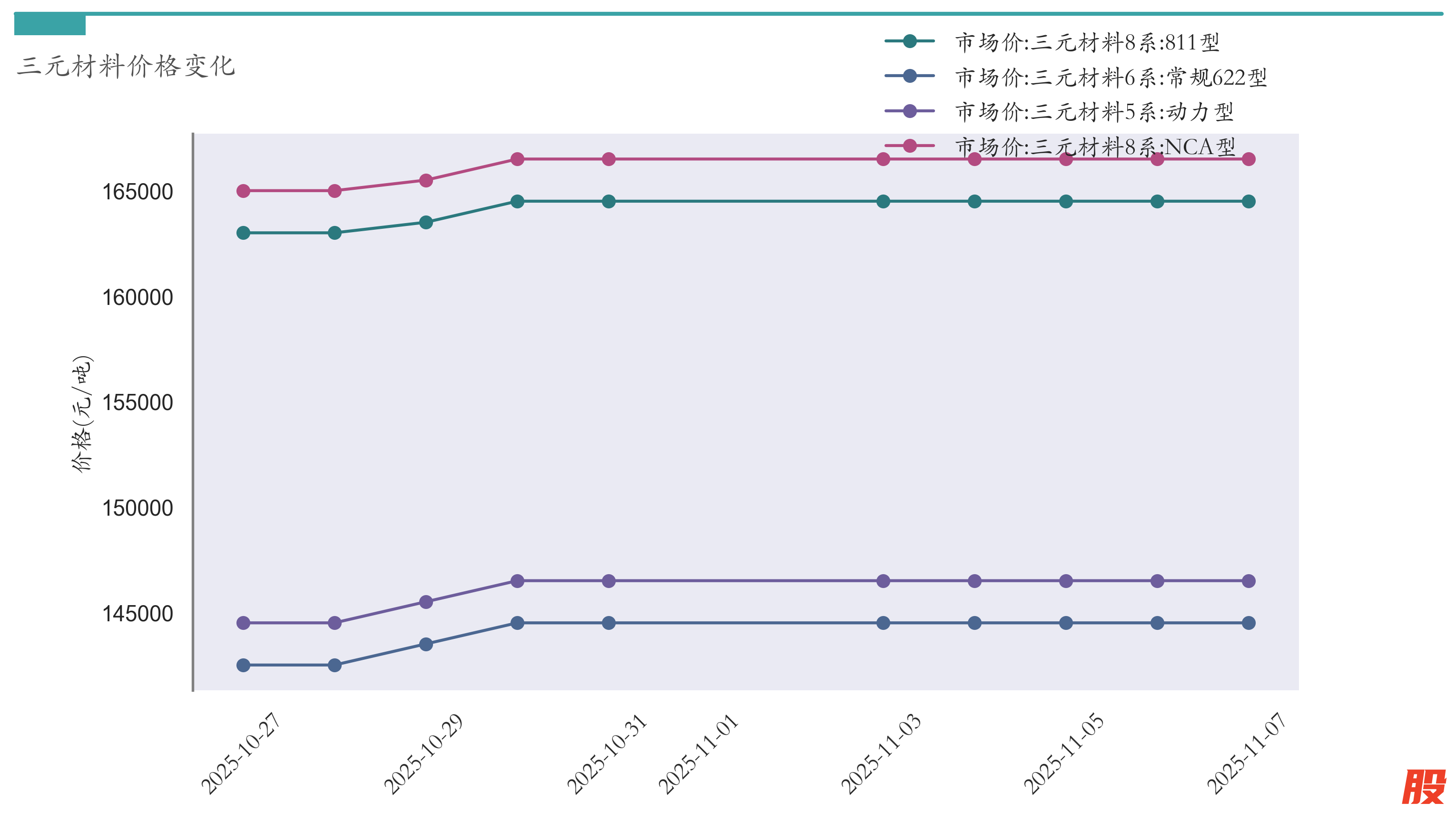 截至11月7日,三元材料8系:811型市场报价为164500元/吨,较10月31日持平。三元材料8系:NCA型市场报价为166500元/吨,较10月31日持平。三元材料6系:常规622型市场报价为144500元/吨,较10月31日持平。三元材料5系:动力型市场报价为146500元/吨,较10月31日持平。近两周三元材料价格变化如下图所示: