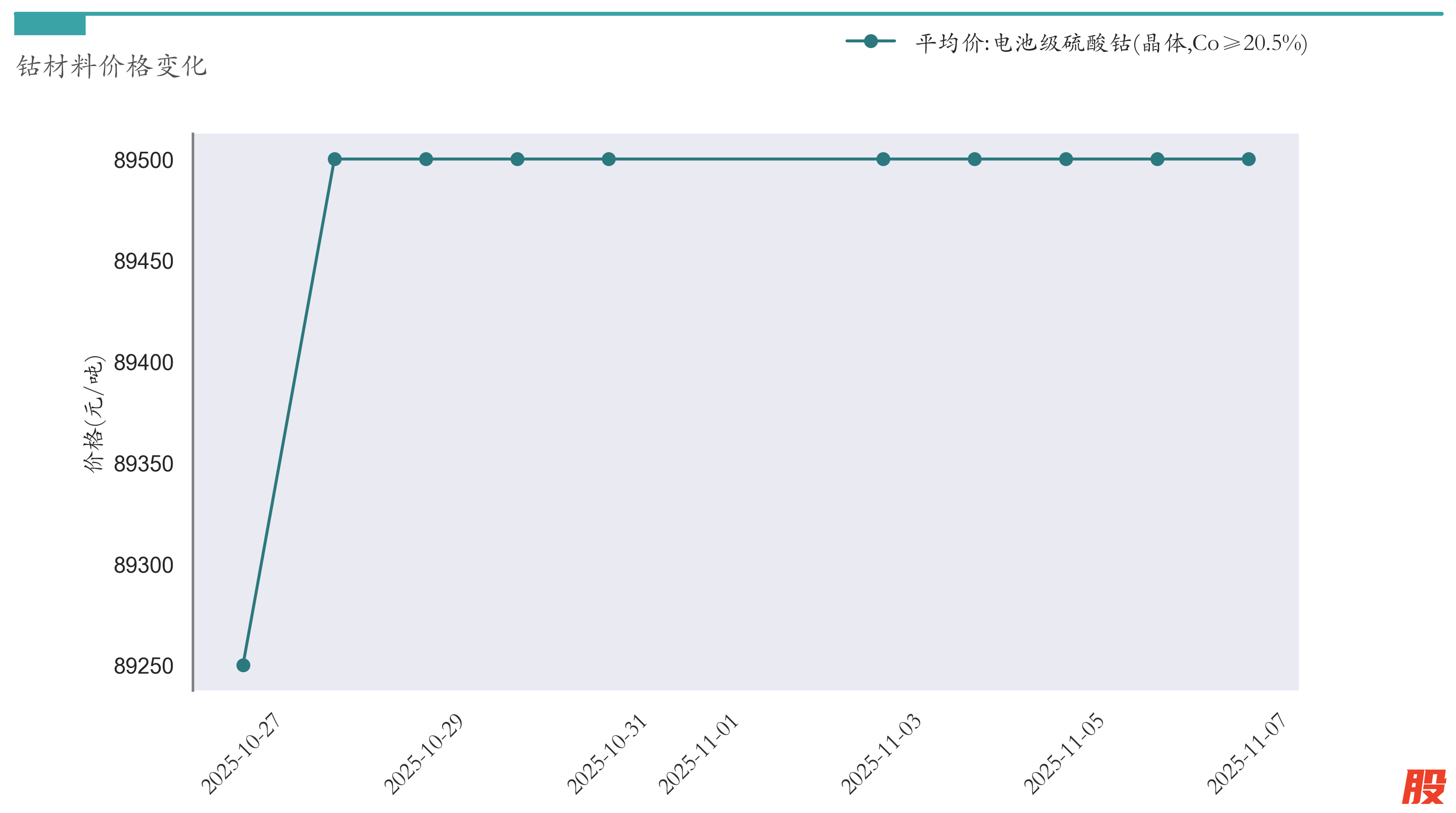 截至11月7日,电池级硫酸钴平均报价为89500元/吨,较10月31日持平。近两周钴材料价格变化如下图所示: