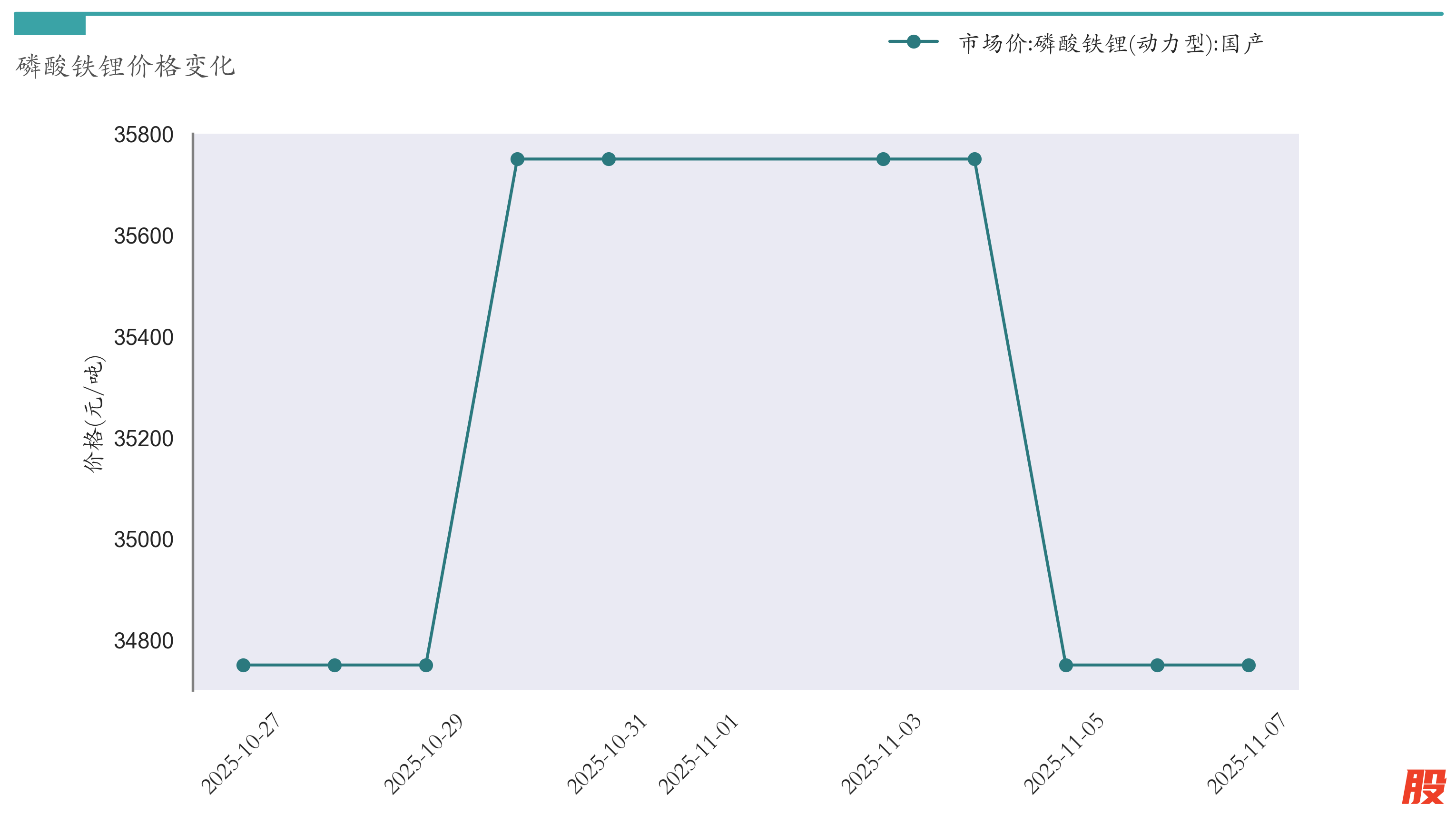 截至11月7日,磷酸铁锂市场报价为34750元/吨,较10月31日下跌1000元/吨。近两周磷酸铁锂价格变化如下图所示: