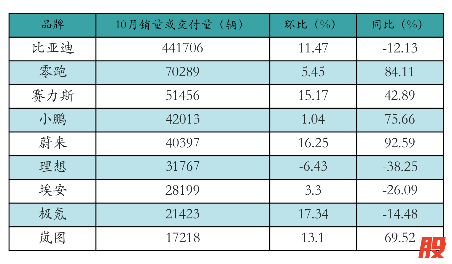 10月新能源车企销量或交付量如下图所示: