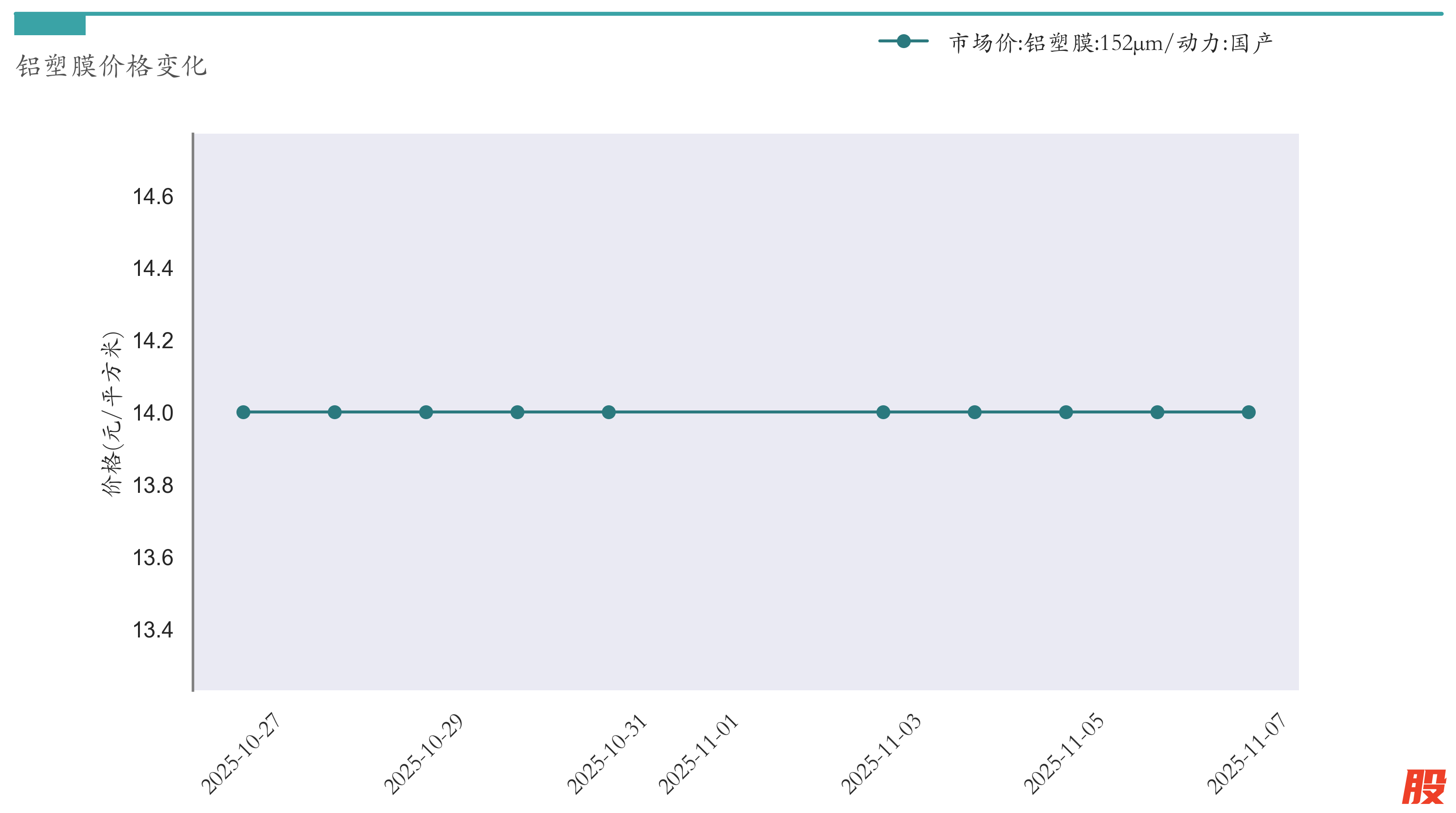 截至11月7日,152μm铝塑膜市场报价为14元/平方米,较10月31日持平。近两周铝塑膜价格变化如下图所示: