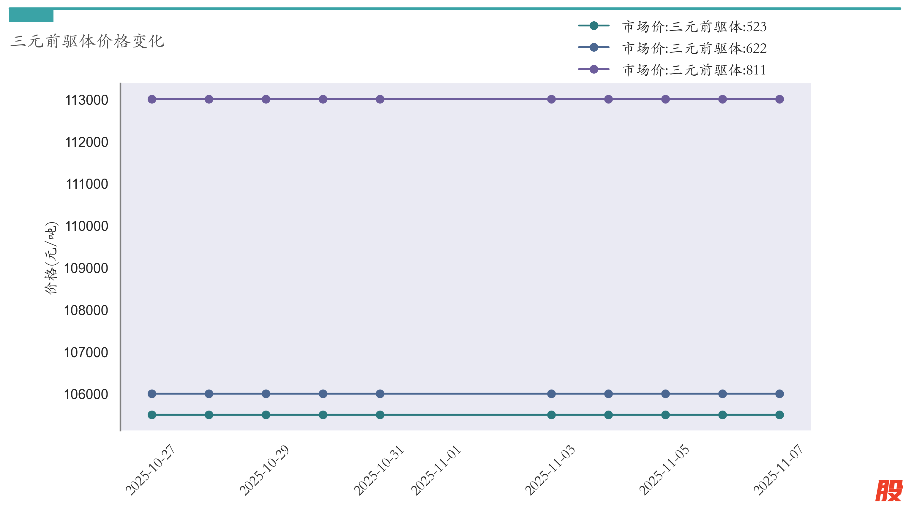 截至11月7日,三元前驱体811市场报价为113000元/吨,较10月31日持平。三元前驱体622市场报价为106000元/吨,较10月31日持平。三元前驱体523市场报价为105500元/吨,较10月31日持平。近两周三元前驱体价格变化如下图所示: