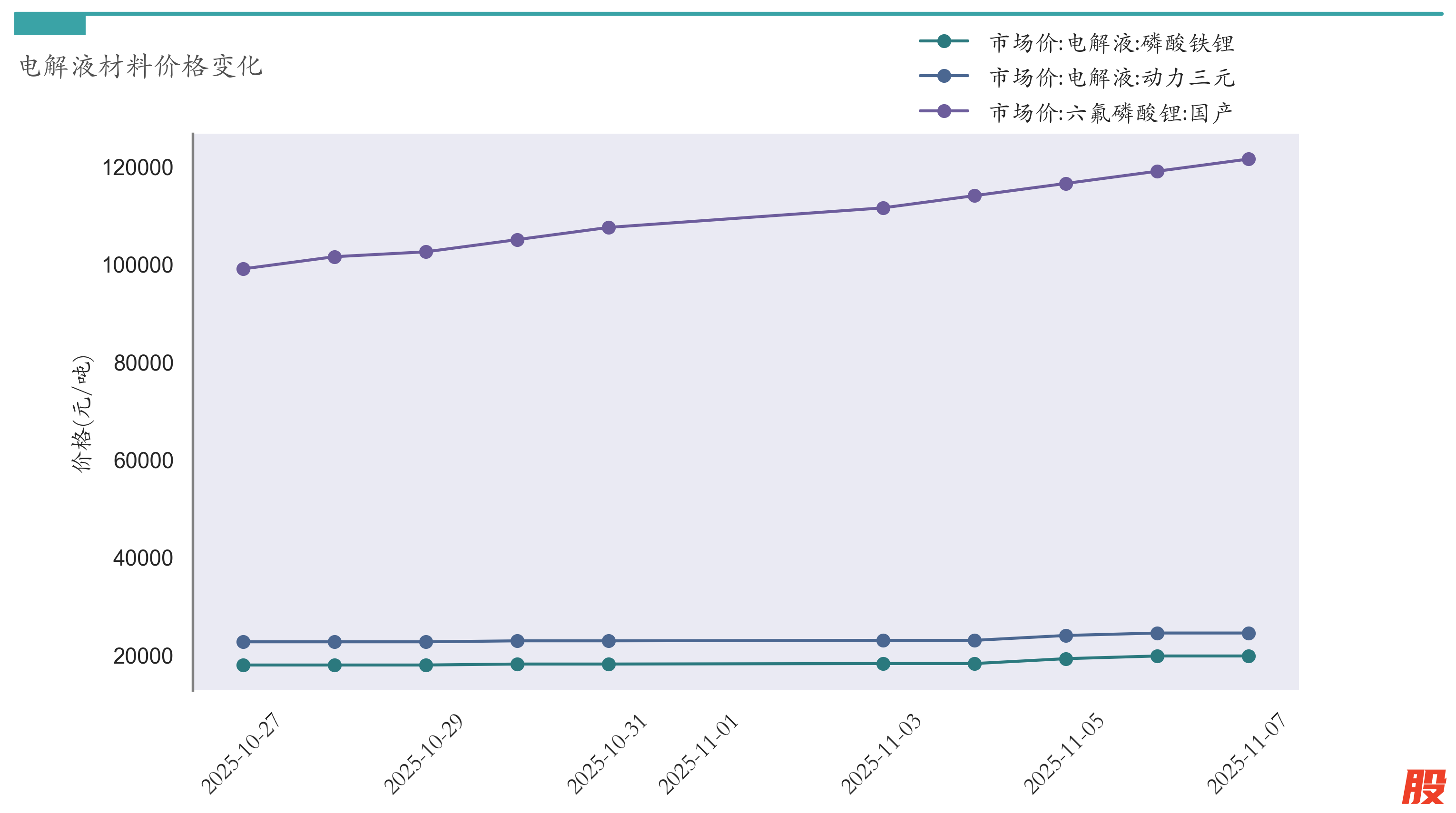 截至11月7日,六氟磷酸锂市场报价为121500元/吨,较10月31日上涨14000元/吨。电解液(磷酸铁锂)市场报价为19750元/吨,较10月31日上涨1650元/吨。电解液(动力三元)市场报价为24450元/吨,较10月31日上涨1600元/吨。近两周电解液材料价格变化如下图所示: