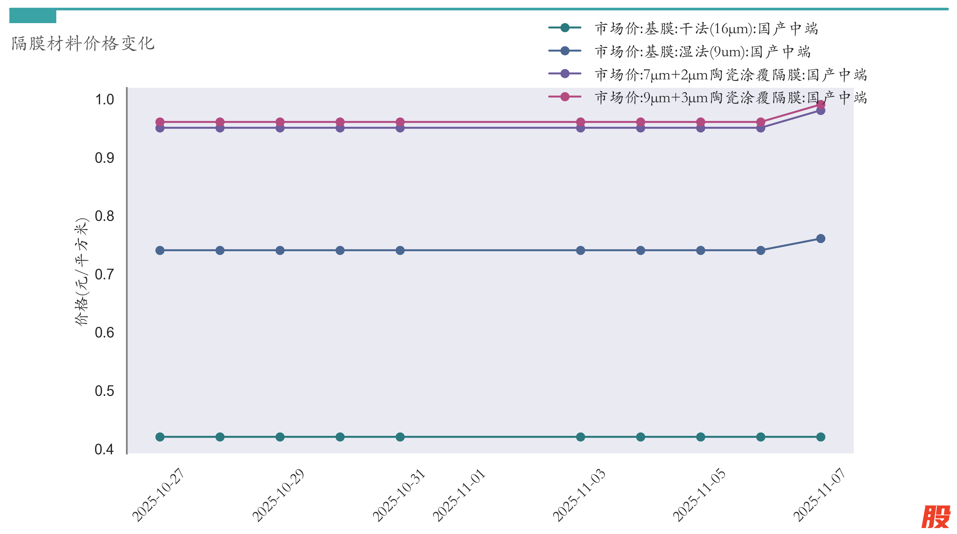 截至11月7日,干法16μm基膜市场报价为0.42元/平方米,较10月31日持平。湿法9um基膜市场报价为0.76元/平方米,较10月31日上涨0.02元/平方米。7μm+2μm陶瓷涂覆隔膜市场报价为0.98元/平方米,较10月31日上涨0.03元/平方米。9μm+3μm陶瓷涂覆隔膜市场报价为0.99元/平方米,较10月31日上涨0.03元/平方米。近两周隔膜材料价格变化如下图所示: